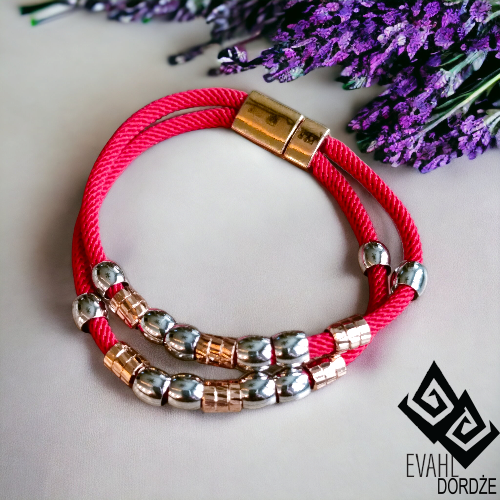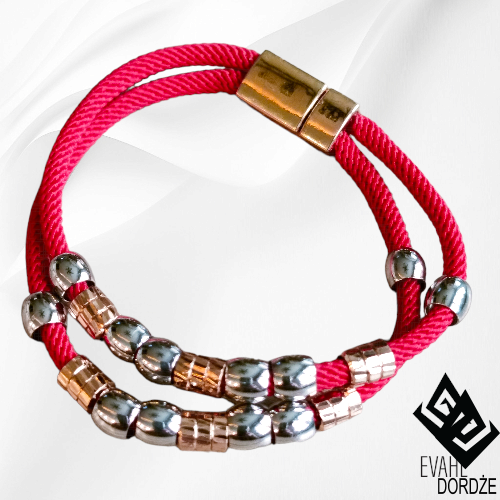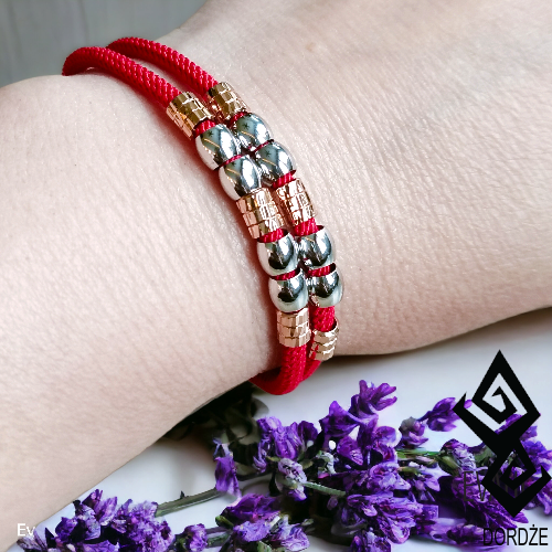 Sam kolor czerwony jest oznaką Siły i Życiowej Energii. Natomiast dodając do bransoletki Energię Bogactwa i Fortuny – czyli blask złota, otrzymujemy BARDZO SILNY AMULET I TALIZMAN przyciągający Propserity a odpędzający pecha.